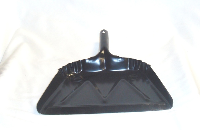 Black metal janitor dust pan is 20 gauge steel. Baked enamel finish is durable with beveled edge. Corrugated ribs add to strength.